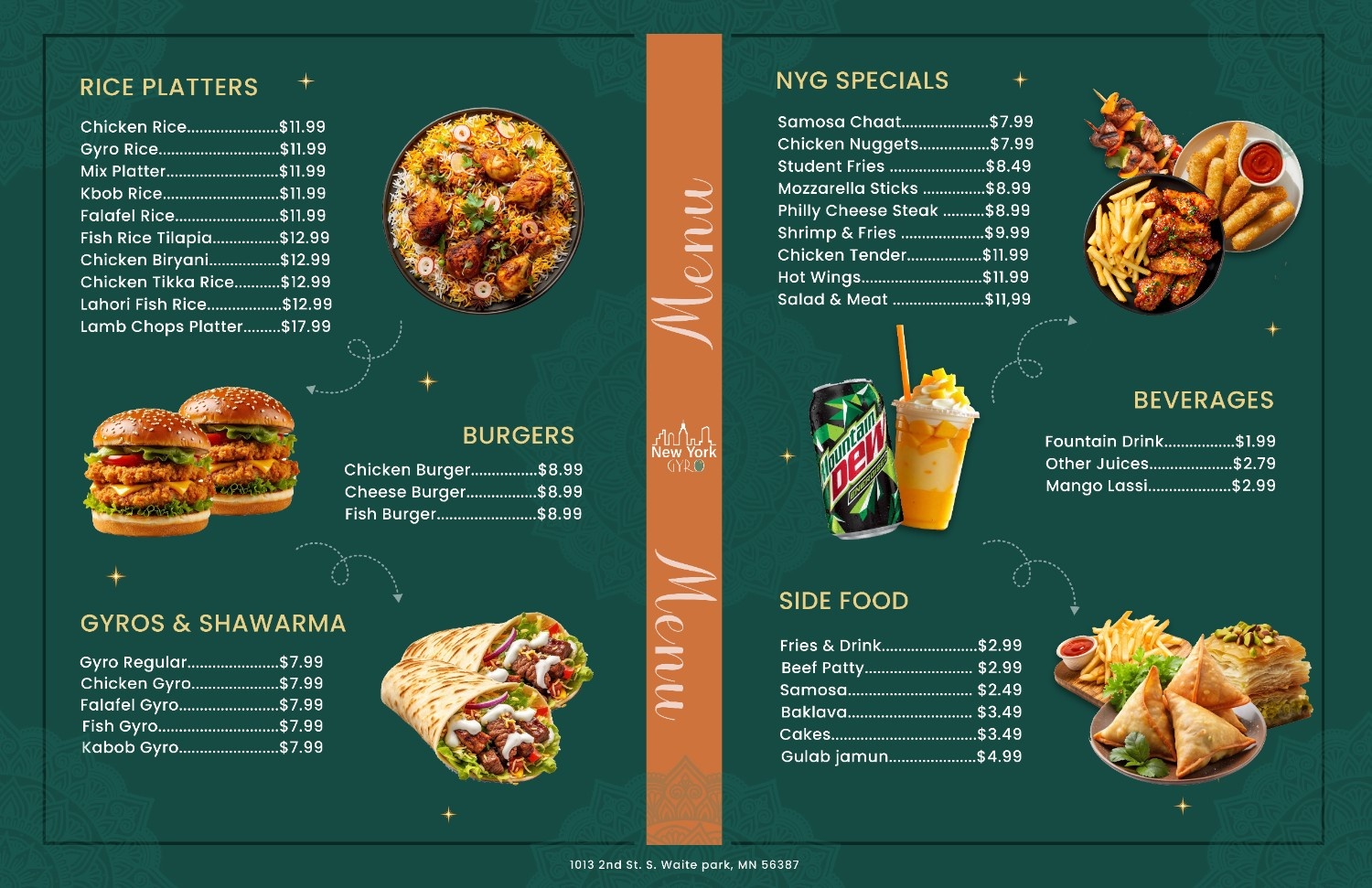 Welcome to New York Gyro Waite Park, a place where rich spices, high-quality ingredients, and traditional Halal recipes come together in every dish. From our signature gyros and slow-marinated shawarmas to refreshing salads and hearty platters, everything is made fresh to bring you bold, unforgettable flavor.